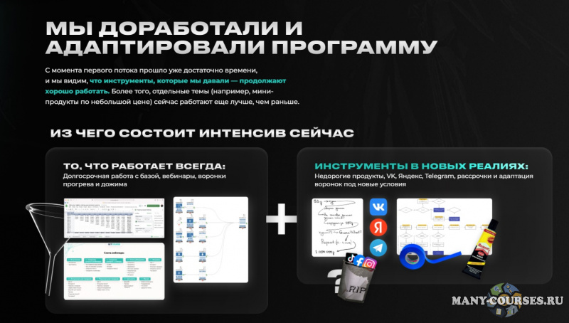 - 7 ключевых тем-модулей. От стратегии воронок и продуктовой линейки до 3-х уровневых ретаргетинговых кампаний в закупке трафика.