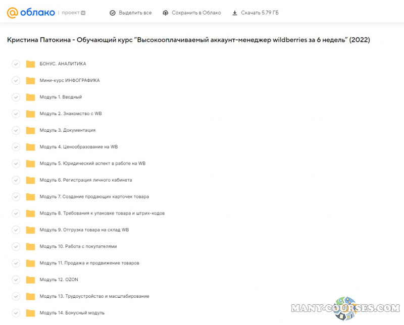 Вы находитесь на странице товара «Кристина Патокина - Обучающий курс “Высокооплачиваемый аккаунт-менеджер wildberries за 6 недель”», это материал 2022 года, который, мы надеемся, принесет вам пользу. Данный курс расположен на платформе «Облако Mail».Скриншоты с платформы на которой расположены материалы вы можете найти выше. В нашем магазине курсы доступны по самым выгодным ценам. Вы можете перейти на оригинальный продажник, после чего принять решение о покупке. Если бы вы покупали у самого автора, то данный курс вам обошелся 36789 рублей. Вы получаете этот курс, купив в нашем магазине MANY-COURSES.NET, с огромной скидкой, всего 755 рублей. Обучающий курс входит в рубрику «Бизнес, менеджмент, продажи / Wildberries / Ozon», вы можете поискать другие сливы курсов в этой рубрике. В нашем магазине Вы найдёте ещё много курсов от автора «Кристина Патокина», достаточно ввести в поиск имя автора.