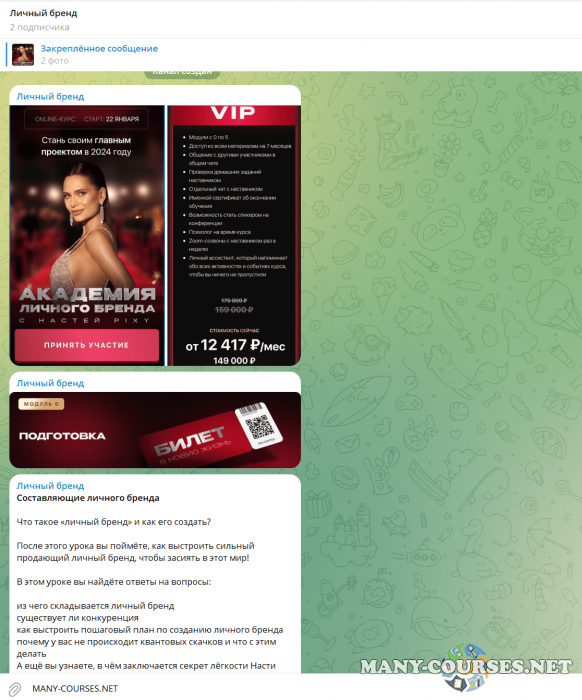 Вы находитесь на странице товара «Настя Pixy - Академия личного бренда. Тариф VIP (2024)», это материал 2024 года, который, мы надеемся, принесет вам пользу. Данный курс расположен на платформе «Канал Telegram».Скриншоты с платформы на которой расположены материалы вы можете найти выше. В нашем магазине курсы доступны по самым выгодным ценам. Вы можете перейти на оригинальный продажник, после чего принять решение о покупке. Если бы вы покупали у самого автора, то данный курс вам обошелся 149000 рублей. Вы получаете этот курс, купив в нашем магазине MANY-COURSES.NET, с огромной скидкой, всего 3490 рублей. Обучающий курс входит в рубрику «Бизнес, менеджмент, продажи», вы можете поискать другие сливы курсов в этой рубрике. В нашем магазине Вы найдёте ещё много курсов от автора «Настя Pixy», достаточно ввести в поиск имя автора.