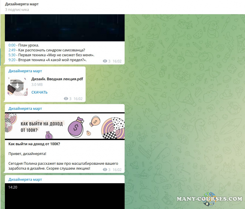 Вы находитесь на странице товара «Nioly / Полина Пушкарева - Дизайнерята. Тариф - VIP», это материал 2022 года, который, мы надеемся, принесет вам пользу. Данный курс расположен на платформе «Канал Telegram».Скриншоты с платформы на которой расположены материалы вы можете найти выше. В нашем магазине курсы доступны по самым выгодным ценам. Вы можете перейти на оригинальный продажник, после чего принять решение о покупке. Если бы вы покупали у самого автора, то данный курс вам обошелся 24990 рублей. Вы получаете этот курс, купив в нашем магазине MANY-COURSES.NET, с огромной скидкой, всего 990 рублей. Обучающий курс входит в рубрику «Графика и Дизайн», вы можете поискать другие сливы курсов в этой рубрике. В нашем магазине Вы найдёте ещё много курсов от автора «Полина Пушкарева», достаточно ввести в поиск имя автора.