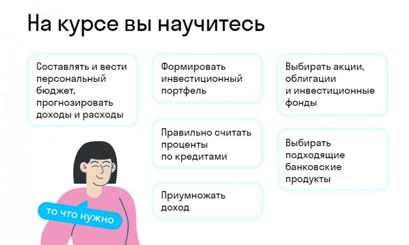 Вы поймёте, как вести учёт денег и оптимизировать траты. Вы узнаете, как получать дополнительный доход с дебетовой и кредитной карт и сможете выбирать выгодные банковские продукты и грамотно рассчитывать проценты по кредитам. Вы освоите инвестиционные инструменты и поймёте, какие из них подходят для ваших финансовых целей, научитесь открывать брокерский счёт, рассчитывать сумму ежемесячных вложений, покупать акции и облигации и выбирать инвестиционные фонды. Вы разберётесь в ошибках начинающих инвесторов и налоговых обязательствах и сможете оформить налоговый вычет.