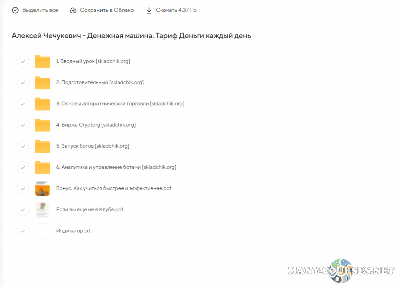 Вы находитесь на странице товара «Алексей Чечукевич - Денежная машина. Тариф Деньги каждый день», это материал 2023 года, который, мы надеемся, принесет вам пользу. Данный курс расположен на платформе «Яндекс Диск».Скриншоты с платформы на которой расположены материалы вы можете найти выше. В нашем магазине курсы доступны по самым выгодным ценам. Вы получаете этот курс, купив в нашем магазине MANY-COURSES.NET, с огромной скидкой, всего 500 рублей. Обучающий курс входит в рубрику «Инвестиции, Трейдинг, Криптовалюта», вы можете поискать другие сливы курсов в этой рубрике. В нашем магазине Вы найдёте ещё много курсов от автора «Алексей Чечукевич», достаточно ввести в поиск имя автора.