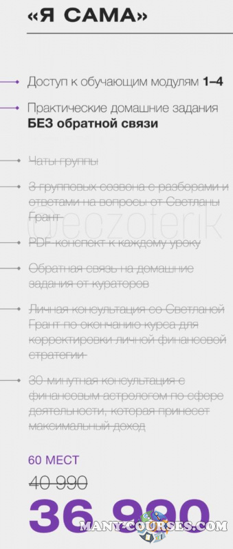 Вы находитесь на странице товара «Светлана Грант - Без купюр 4.0. Тариф Я сама», это материал 2022 года, который, мы надеемся, принесет вам пользу. Данный курс расположен на платформе «Облако Mail».Скриншоты с платформы на которой расположены материалы вы можете найти выше. В нашем магазине курсы доступны по самым выгодным ценам. Если бы вы покупали у самого автора, то данный курс вам обошелся 36990 рублей. Вы получаете этот курс, купив в нашем магазине MANY-COURSES.NET, с огромной скидкой, всего 990 рублей. Обучающий курс входит в рубрику «Эзотерика и оккультизм», вы можете поискать другие сливы курсов в этой рубрике. В нашем магазине Вы найдёте ещё много курсов от автора «Светлана Грант», достаточно ввести в поиск имя автора.