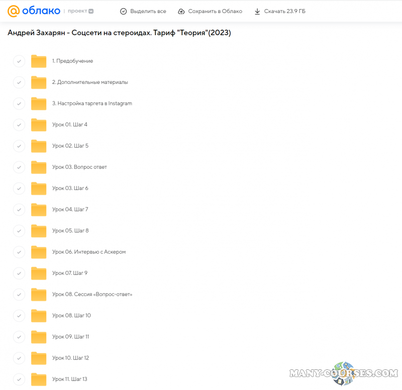 Вы находитесь на странице товара «Андрей Захарян - Соцсети на стероидах. Тариф Теория (2023)», это материал 2023 года, который, мы надеемся, принесет вам пользу. Данный курс расположен на платформе «Облако Mail».Скриншоты с платформы на которой расположены материалы вы можете найти выше. В нашем магазине курсы доступны по самым выгодным ценам. Вы можете перейти на оригинальный продажник, после чего принять решение о покупке. Если бы вы покупали у самого автора, то данный курс вам обошелся 48440 рублей. Вы получаете этот курс, купив в нашем магазине MANY-COURSES.NET, с огромной скидкой, всего 550 рублей. Обучающий курс входит в рубрику «SEO и SMM / YouTube / Бизнес, менеджмент, продажи / Реклама и маркетинг», вы можете поискать другие сливы курсов в этой рубрике. В нашем магазине Вы найдёте ещё много курсов от автора «Андрей Захарян», достаточно ввести в поиск имя автора.