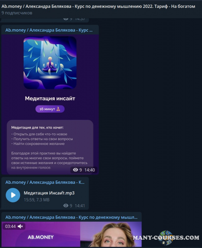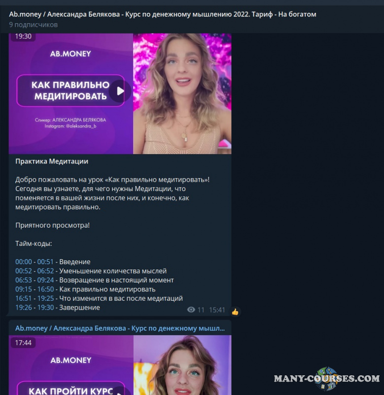 Вы находитесь на странице товара «Ab.money / Александра Белякова - Курс по денежному мышлению. Тариф - На богатом», это материал 2022 года, который, мы надеемся, принесет вам пользу. Данный курс расположен на платформе «Канал Telegram».Скриншоты с платформы на которой расположены материалы вы можете найти выше. В нашем магазине курсы доступны по самым выгодным ценам. Вы можете перейти на оригинальный продажник, после чего принять решение о покупке. Если бы вы покупали у самого автора, то данный курс вам обошелся 88888 рублей. Вы получаете этот курс, купив в нашем магазине MANY-COURSES.NET, с огромной скидкой, всего 990 рублей. Обучающий курс входит в рубрику «Курсы от Александры Беляковой / Эзотерика и оккультизм / Психология», вы можете поискать другие сливы курсов в этой рубрике. В нашем магазине Вы найдёте ещё много курсов от автора «Александра Белякова», достаточно ввести в поиск имя автора.